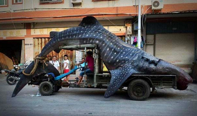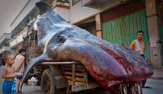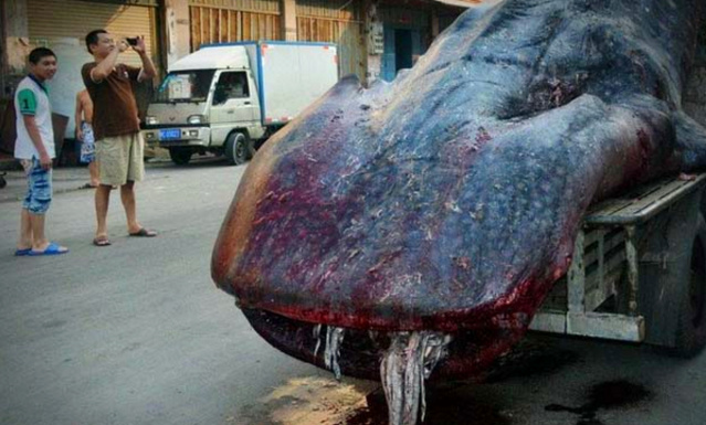 隨著拍攝者的鏡頭和圖片你可以看到這個龐然大物明顯是一個深海里的動物,走近才發(fā)現(xiàn)原材料是一頭鯨魚,這個大個兒被放在車上,嘴巴裸露著鮮血,明顯能感覺得出已經(jīng)死了。
