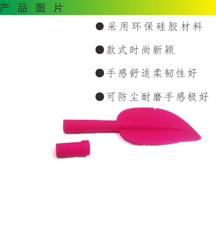 13712483599羽毛形狀硅膠筆套,是硅膠制品中的一種,由東莞帝博硅膠制品廠家創(chuàng)意研發(fā),在筆套內套上直徑為6cm左右大的筆芯即可使用,材料選用環(huán)保硅膠高溫成型,無毒無味,產品柔軟有彈性,而且非常的有手感,書寫更華麗。適合很多場合使用,搭配鮮艷的顏色更是讓這款產品如虎添翼,找不出一點瑕疵。